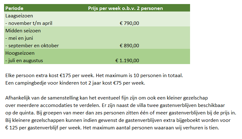 De quinta is het hele jaar te huur. Van november t/m april is het zwembad gesloten en worden de gastenverblijven niet verhuurd.
